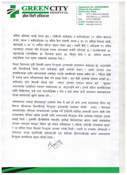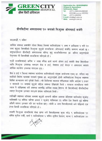 काठमाडौं अबस्थित चर्चित ग्रीनसिटी हस्पिटलमा गरीब दुखी र असहाय दश जना बिरामीको निशुल्क ओपेन हर्ट सर्जरी सम्पन्न ! अरु हस्पिटलले पनि केही सिकुन ग्रीनसिटी हस्पिटलबाट